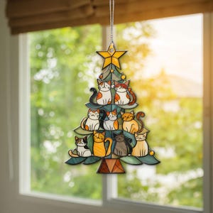 Cat Christmas Tree Suncatcher, Christmas Tree Made of Cats Acrylic Suncatcher, Christmas Home Decor Cat Art, Flat 2D Suncatcher